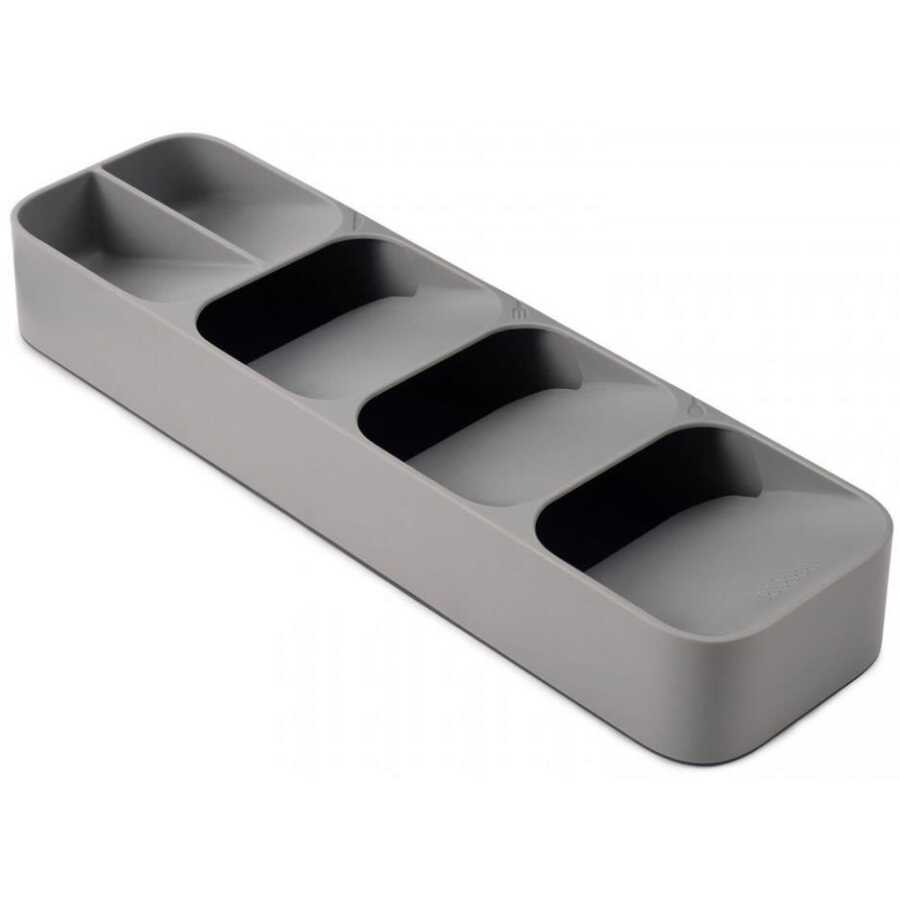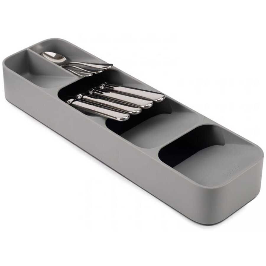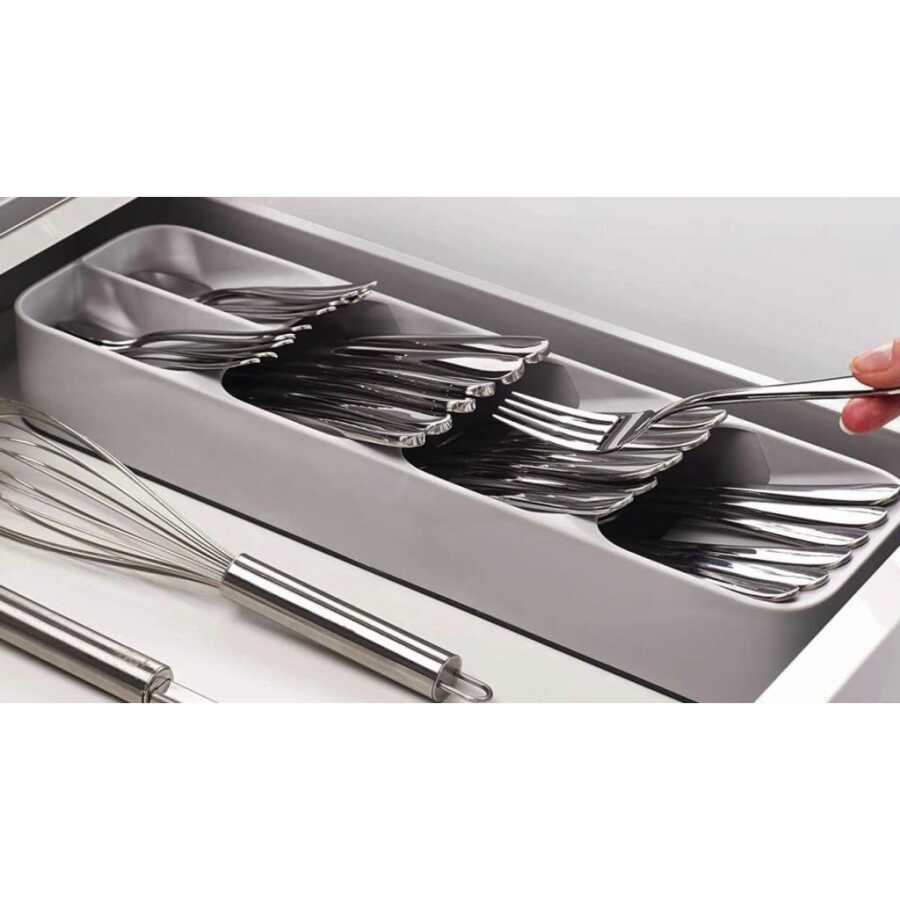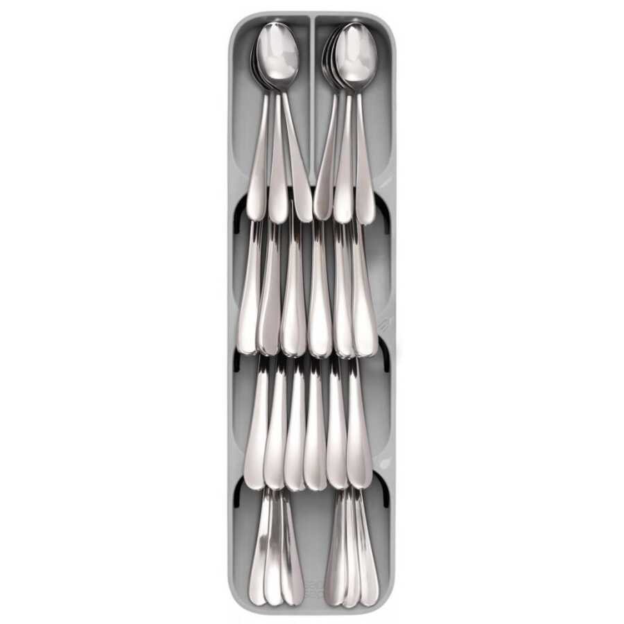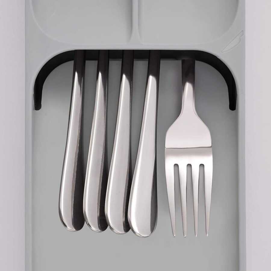 Bölmelerin açılı olarak birbirinin üzerine uzanması sayesinde, sıradan bir çatal kaşık tepsisinin kapladığı yerin yarısı kadarını kullanarak tam bir yemek takımı saklayabilirsiniz. Gereçleri başları dışarıda kalacak şekilde de koyabilirsiniz ama ünitenin üzerinde çatal, kaşık ve bıçak simgeleri olduğu için gereçlerin sapları dışarı bakabilir.