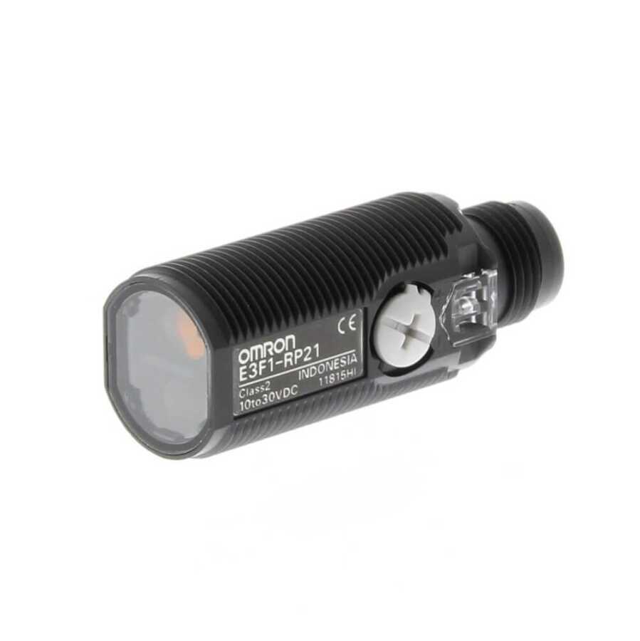 Omron E3F1-RP21 OMI PES Fotoelektrik sensor, M18 eksenel, plastik govde, kirmizi LED, reflektorlu, 0.1-3m, PNP, L-ON/D-ON secilebilir, M12 konnektor