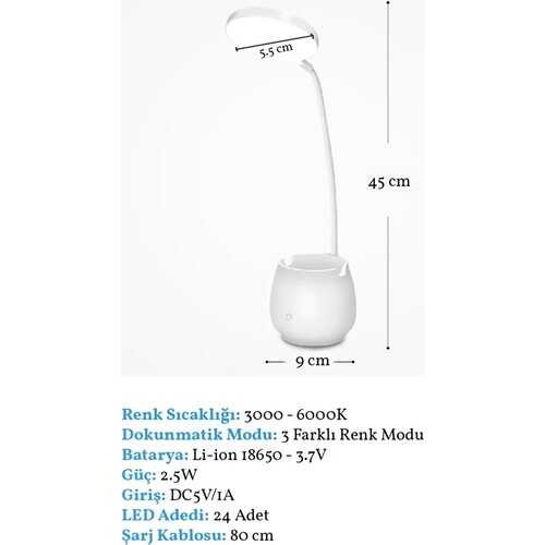 Gelince Sizi ArayalımŞarjlı Dokunmatik Masa Lambası 3 Kademeli Kalemlikli Ve Telefon Standlı Ders Çalışma Okuma Led Lamba Şartname: Işık kaynağı: 24 LED Işık kaynağı rengi: beyaz ışık/sıcak ışık/sıcak beyaz ışık Anahtar: dokunma Voltaj: 5V Giriş voltajı: 5V 1A Güç: 6W